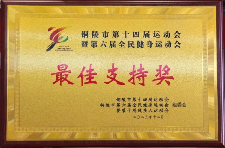 为表彰我中心在2025年铜陵市第十四届运动会暨第六届全民健身运动会期间医疗急救保障突出贡献,赛事组委会向中心颁发“最佳支持奖”,高度肯定中心应急保障能力,确保了赛事成功举办。新的一年,我们将再接再厉,持续提升医疗保障服务水平,全力守护群众健康安全。